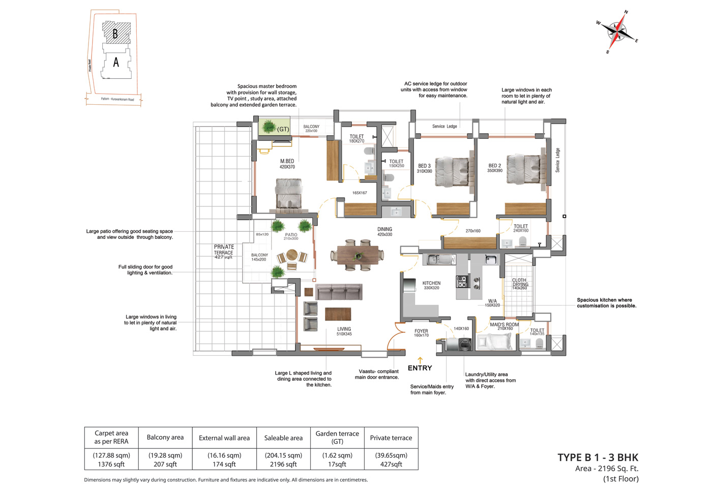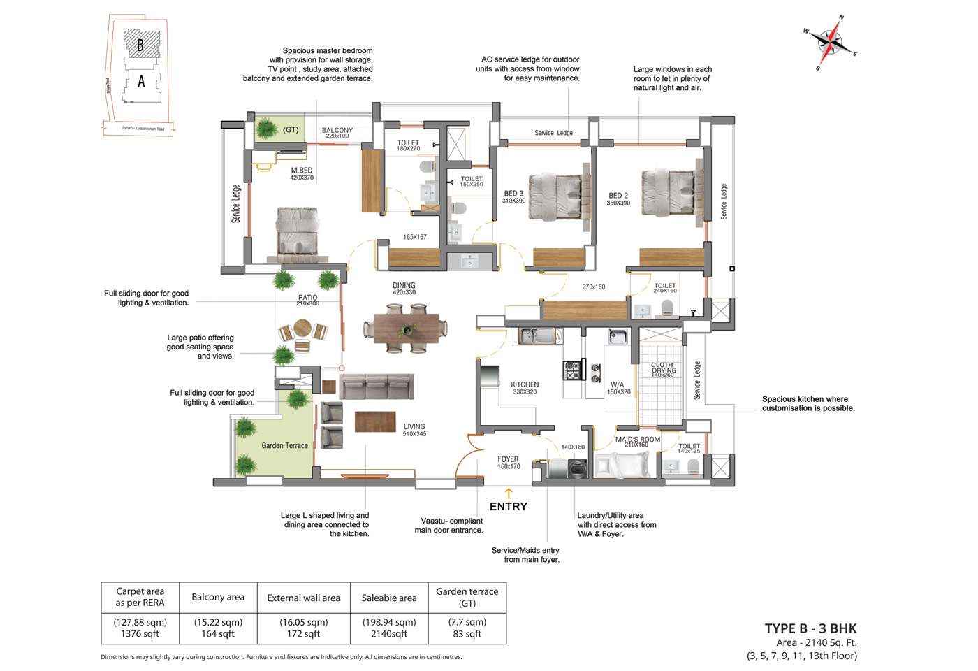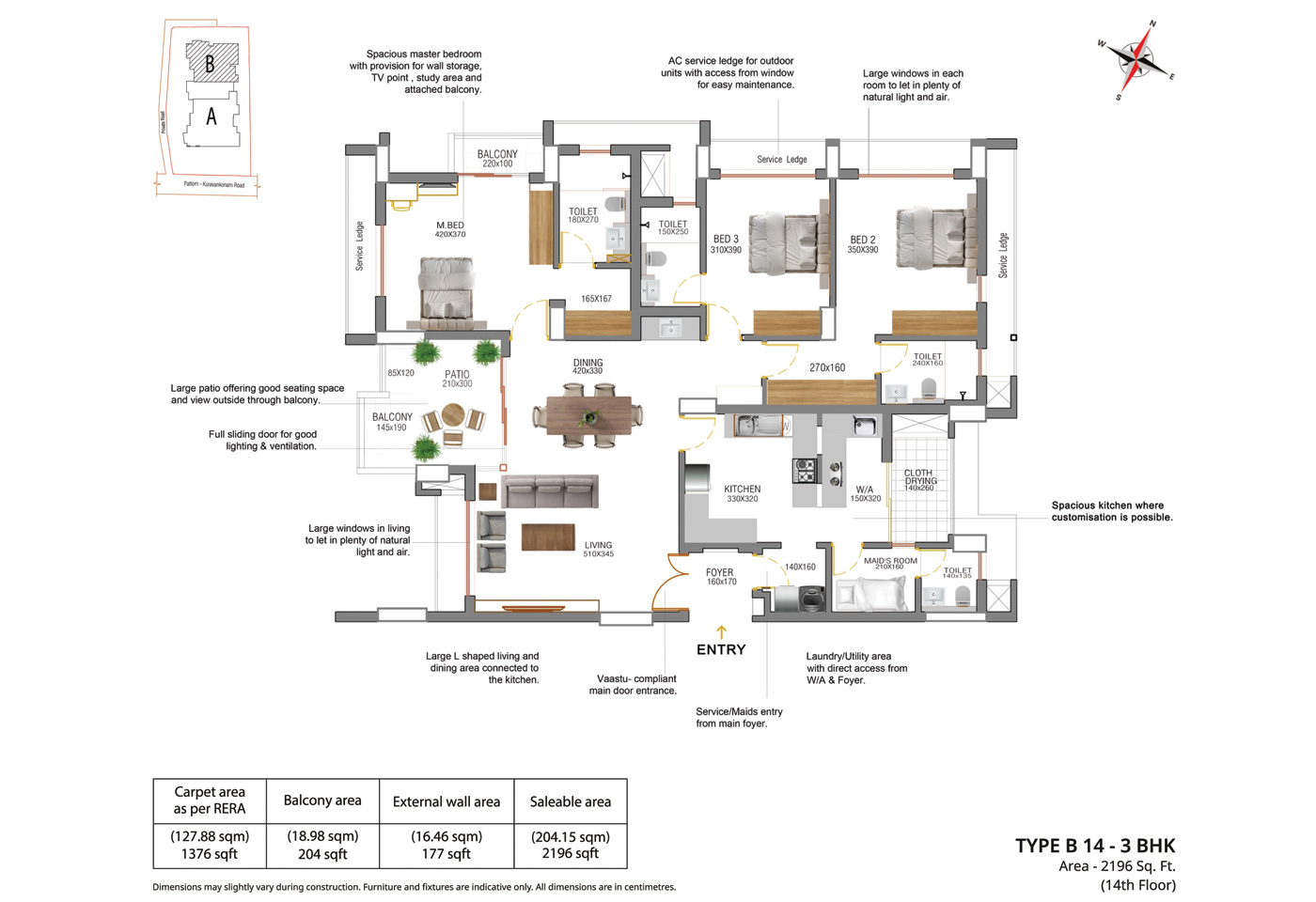 General: Concealed wiring with PVC insulated copper cables and modular type switches. Adequate fan and Light points, 6/16 Amps power plugs controlled by MCB with RCCB protection. Independent energy meter for each apartment