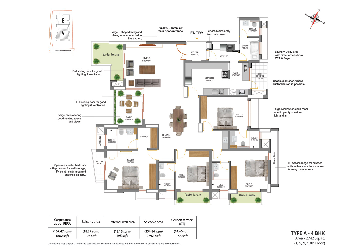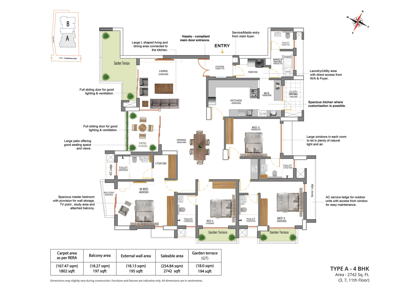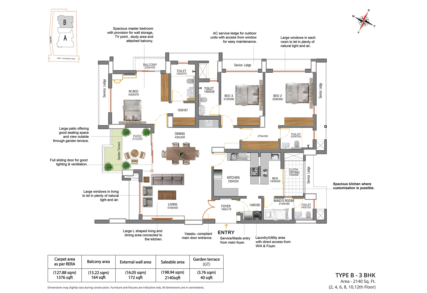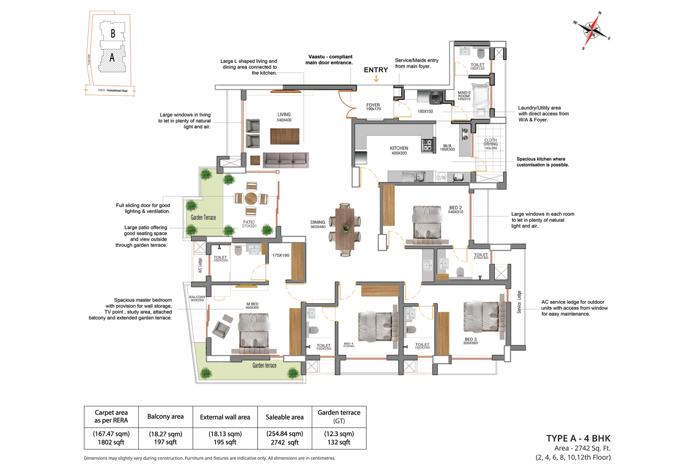 General: Concealed wiring with PVC insulated copper cables and modular type switches. Adequate fan and Light points, 6/16 Amps power plugs controlled by MCB with RCCB protection. Independent energy meter for each apartment